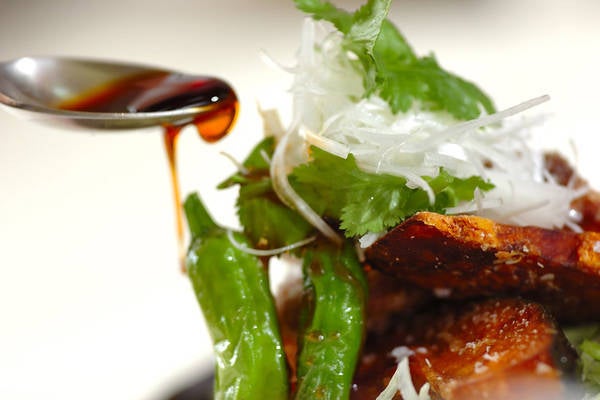 2、器にレタスを敷いて、揚げた(1)を盛り合わせ、香菜と混ぜ合せた白髪ネギをのせ、<タレ>をかける。