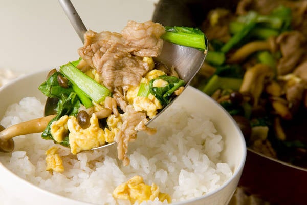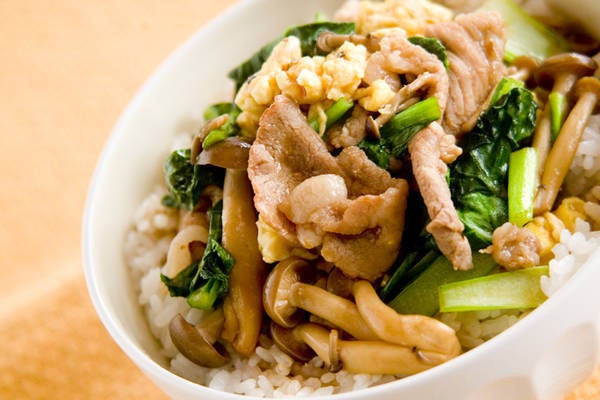 豚肉とふわふわ卵、小松菜としめじを、オイスターソース風味のこっくり味に仕上げ、あつあつのご飯にドーンと乗せる豪快レシピ。