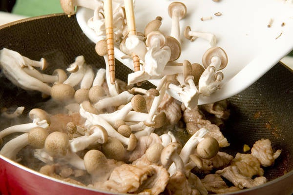 3、フライパンにゴマ油大1/2を足し、豚肉の色が変わるまで炒める。シメジ、<調味料>を加えて更に炒めあわせる。