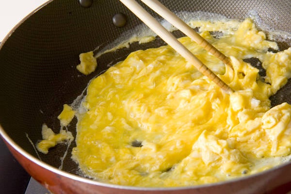 2、フライパンにゴマ油大1を強火で熱し、溶き卵を加える。菜ばしでザックリ混ぜながら半熟になればいったん取り出しておく。