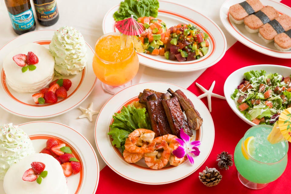 限定のパンケーキの他、アヒポキ&ロミロミサーモン、シーザーサラダ、ガーリックシュリンプ、スペアリブ&グリルポテト、スパムむすびといったハワイを感じさせるラインナップが、楽しいクリスマスを過ごさせてくれそう♪