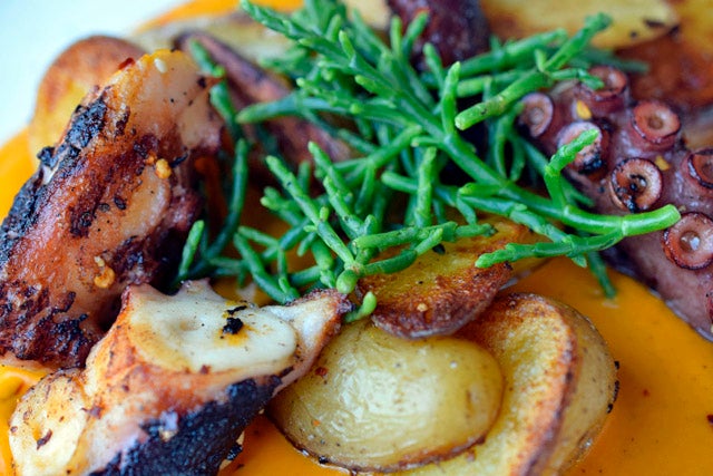 タコはびっくりするほど柔らかく、シーアスパラガスの塩味がいい感じにマッチしています。てっきり甘いと思い込んでいたかぼちゃのソースは超ホット!隠しスパイスたっぷりのエキゾチックな味わいにお酒が進みそう。