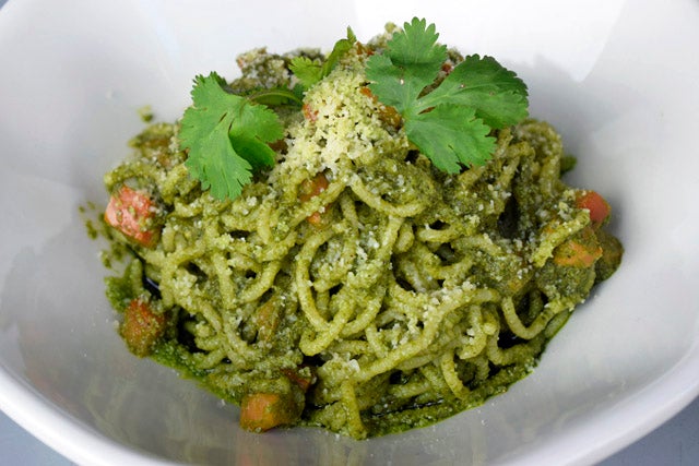 もうひとつのおすすめメニューは日替わりのパスタ。当日のスペシャルはハウスメイドのソースを使ったペストパスタでした。トッピングはイタリアンチーズの王様、パルミジャーノレッジャーノとパクチーという、なんとも個性的な組み合わせ。