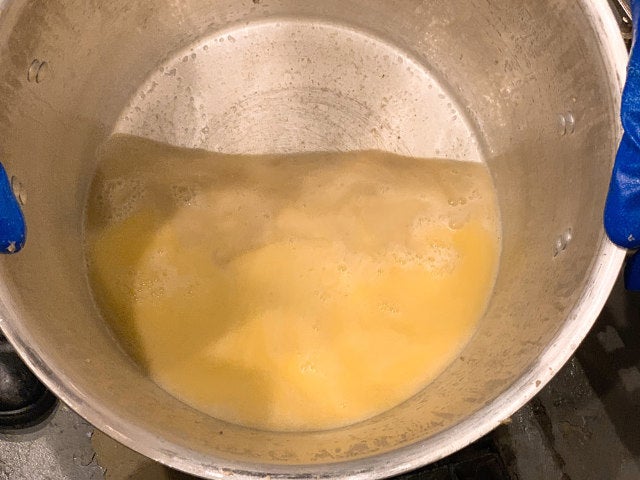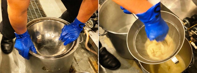 数分間、渾身の力でぐいぐい押し続けると、椎名さんの額からは玉のような汗が。こしたものをさらに目の細かいザルに入れてさらにこし直す。