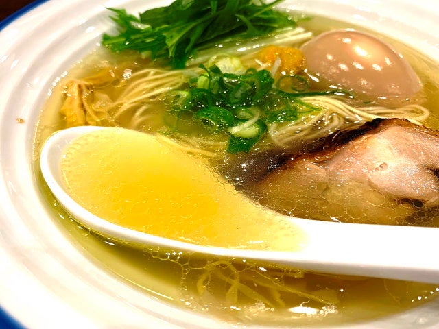 黄金色に輝く透明度の高いスープが美しい。