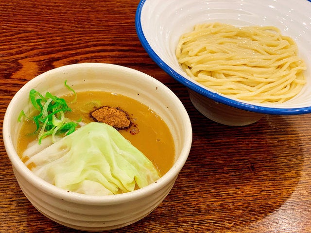 「つけそば」のスープの上には茹でたキャベツと九条ネギ、味変のための魚粉が乗っていて、スープの中に穂先メンマと鶏チャーシューが隠れている。