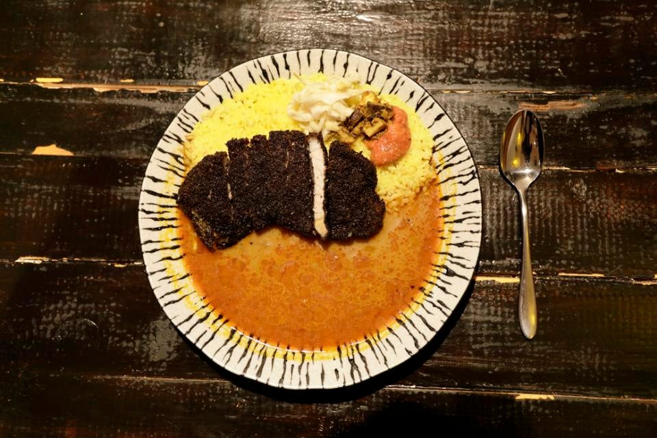インドカレーをベースに、毎日お店でとる出汁とスパイスを合わせたほっとする味わいが人気。小麦粉を使っていないサラサラのカレーに、イカスミ入りのパン粉を使った真っ黒なカツがとろけます。衣にもオリジナルでスパイスを混ぜていて、カレーとの相性がたまりません!