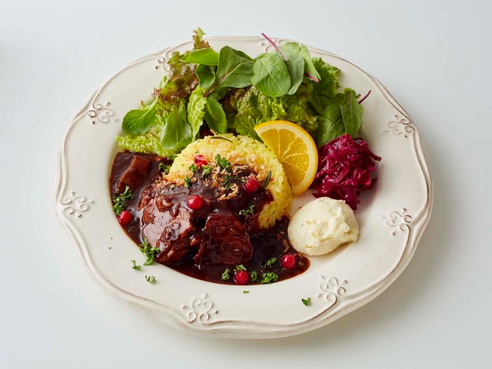 柔らかく煮込んだビーフシチューとローズマリーライスを合わせた1皿。