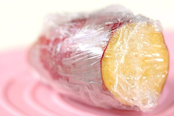 ・サツマイモは皮つきのまま水洗いし、ぬれたままラップに包み、電子レンジで竹串がスッと通る位まで3~4分加熱する。