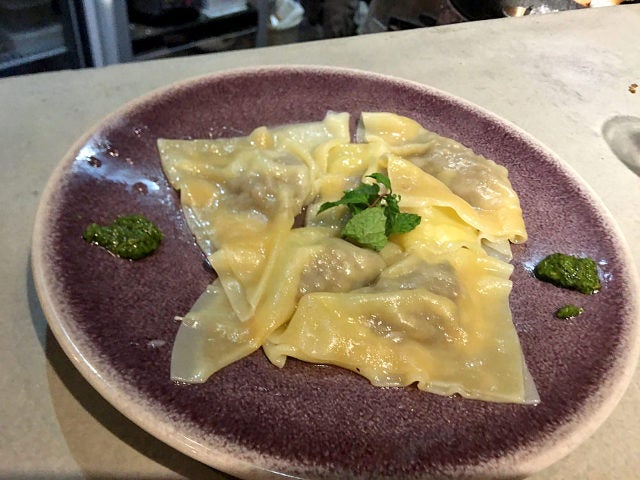 〆に頼んだつもりが、すっかりまた酒が進んでしまう「仔羊のワンタン」にはフレッシュミントと、ミントソースが添えられる。