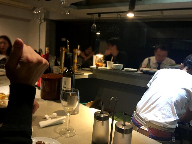 小路側のカウンターに座った笑顔が眩しい女性は、赤星(ラガー)を冷蔵庫から出してシェフに目配せ。