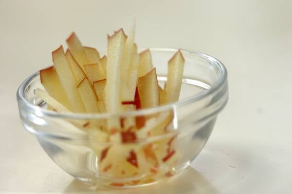 1、リンゴは半分のくし切りにし、ひと切れは皮ごと薄いくし切りにし、皮が残るようにさらに細切りにして水に放つ。