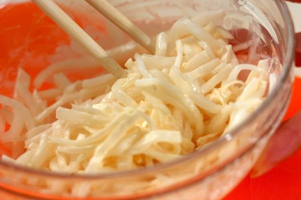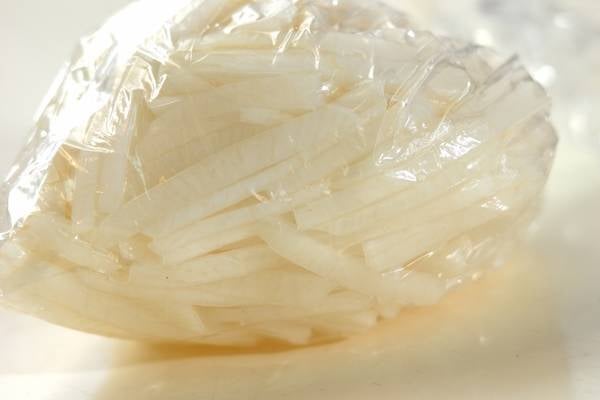 ・大根は皮をむき、薄い輪切りにしてさらに細切りにして抗菌袋に入れ、塩をからめて7~8分おく。
