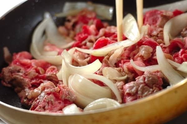 1、フライパンにサラダ油、玉ネギを入れて中火で炒め、しんなりしたら牛肉を加えて炒め合わせる。