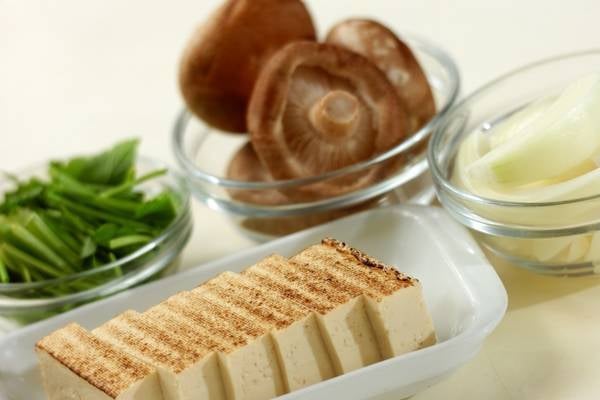 ・焼き豆腐は食べやすい大きさに切る。玉ネギは幅1cmのくし切りにする。シイタケは石づきを切り落とし、大きければ半分に切る。セリは根元をきれいに水洗いし、根ごと長さ4cmに切る。