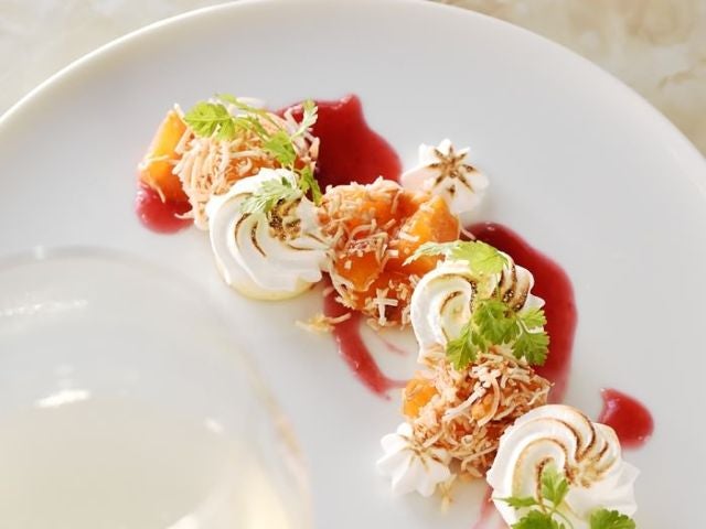 この一皿には、山梨県甲州市『ダイヤモンド酒造』の赤ワイン「シャンテY.Aティント」をペアリング。フランボワーズのベリーとワインのベリー感の相乗効果が、一層おいしく感じさせてくれる。