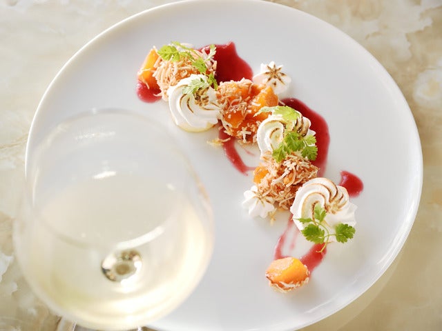 この一皿に合わせるワインは、アメリカのシャルドネ。「柿との相性がよく、レモンやリュバーブの酸味、ほんのり感じるバニラの香りとのマリアージュを楽しんでいただきたいですね」(山本さん)。
