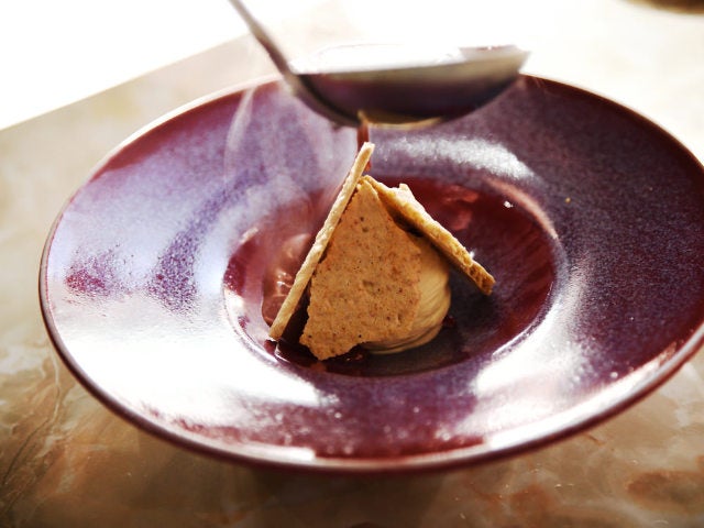 ふわふわのピスタチオムースに、ピスタチオのメレンゲやカリカリのフランボワーズをトッピングしたのち、供される直前に熱々のフランボワーズのショコラショー(ホットチョコレート)がとろ~りと注がれる。