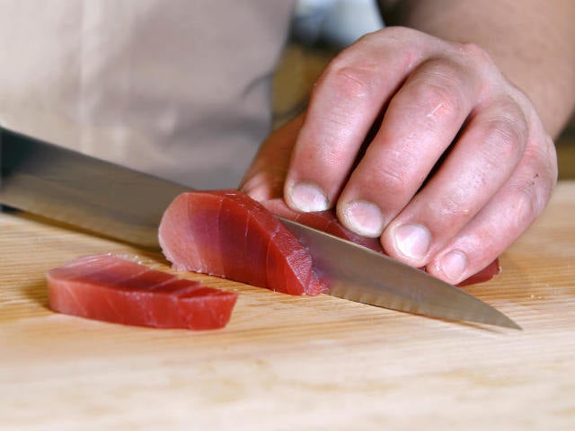 刃が細く、そぎ切りや細造りに適した「柳刃」は主に関西で使用され、刃先が角ばった「蛸引き」は関東で根付いているが、今では「柳刃」が主流と先崎さんは話す。