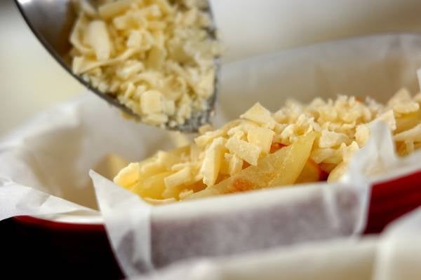 2、グラタン皿にオーブンシートを敷いて(1)を入れてピザ用チーズをかける。