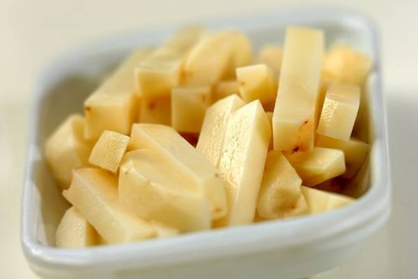 1、ジャガイモは皮をむいて、1cm角の拍子木切りにする。オーブンシートを敷いたオーブントースターの天板に重ならないように広げ、全体に塩とオリーブ油をかけ。20分焼く。