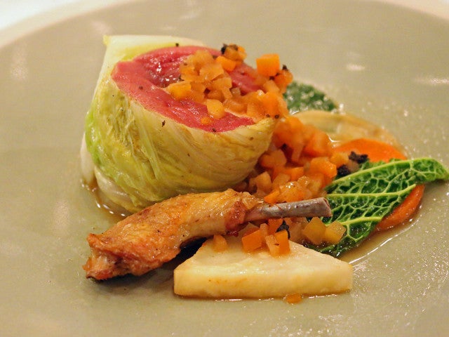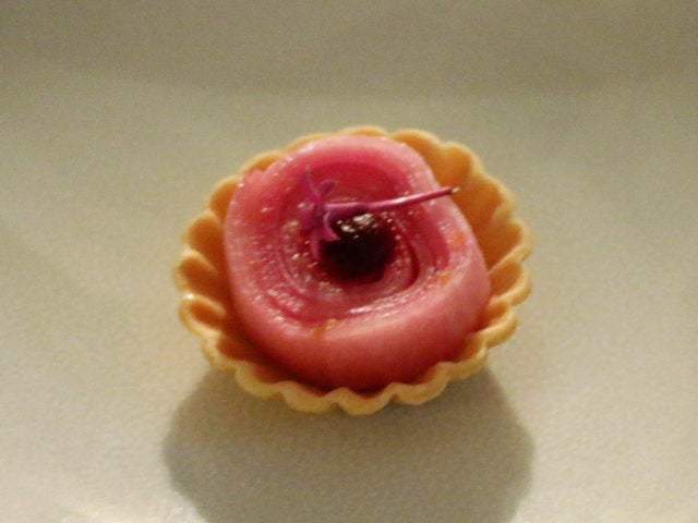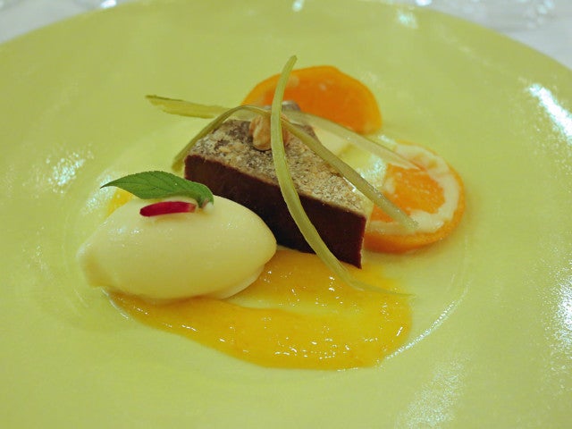 剥いた皮だけをコンフィし、柔らかくなったところでフレッシュな実にくっつけて、再構築されていた。皮の内側にある繊維状の白い部分は、ホワイトチョコで演出。手の込んだ遊び心に会場中のあちこちから感嘆の声があがる。