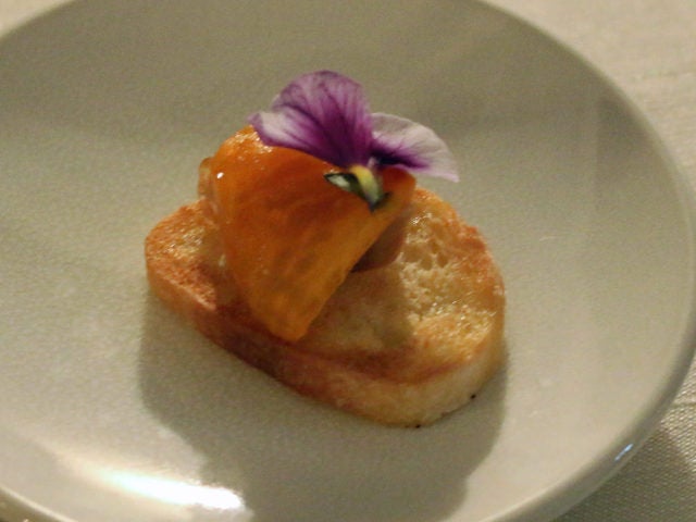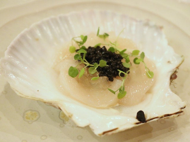琥珀色のジュレは、ヒモからとった帆立のだしをジュレに仕立てたもの。噛むほどに溢れる魚介のうまみとキャビアの塩味で、淡白な帆立の身を華やかにさせる。