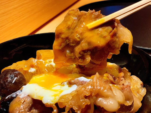 その反面、ともに椀を構成する結び白滝、肉厚なシイタケ、タマネギは、肉のうまみをたっぷり吸いこんだ割下で十分に煮込むことで、丼として味わった時に優しくも濃厚で食べごたえのある仕上がりとなっている。