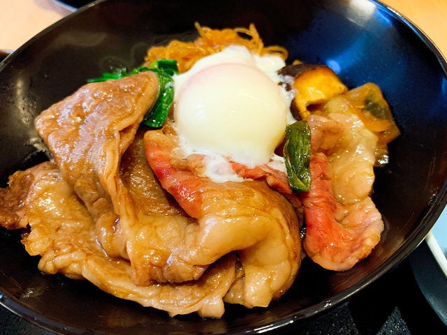 上に乗った温泉卵を崩して肉に付けて食べると、まろやかな甘みが加わりまさに高級店のすき焼きの味。