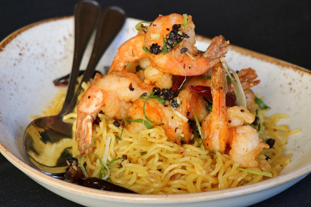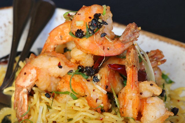プラムソースが香る麺は甘辛く、エビはシンプルに塩コショウのみ。アクセントとしてふりかけられたブラックビーンズと一緒にいただくと、おいしさアップですよ~。