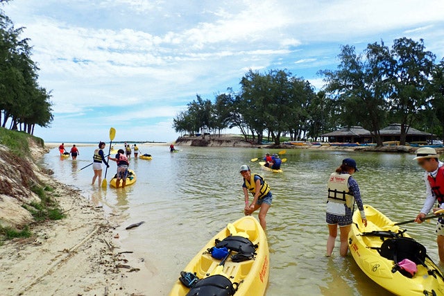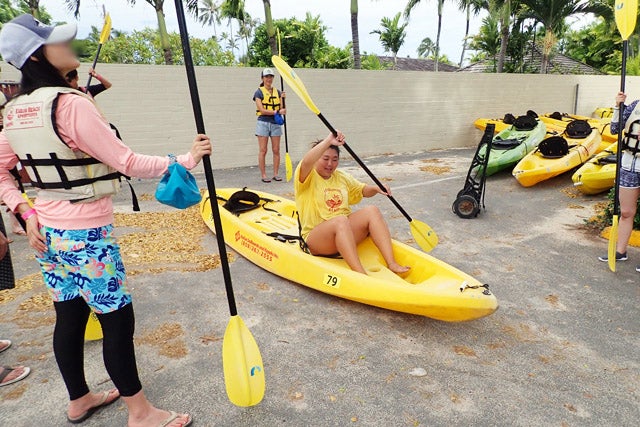 それではいざビーチへ!といきたいところですが、その前に陸上でカヤックの練習を。乗り降りの仕方、オールの持ち方、左右への曲がり方など、わかりやすく日本語で説明してくれます。