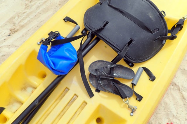 履いていたビーサンと防水バッグをカヤック本体につないで…