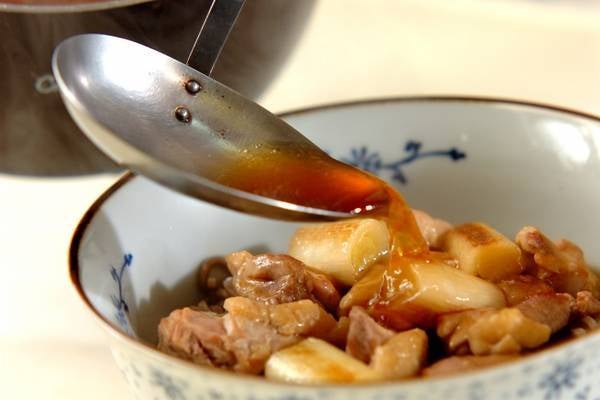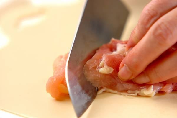 1、鶏もも肉はひとくち大に切る。白ネギは長さ3cmに6本切る。