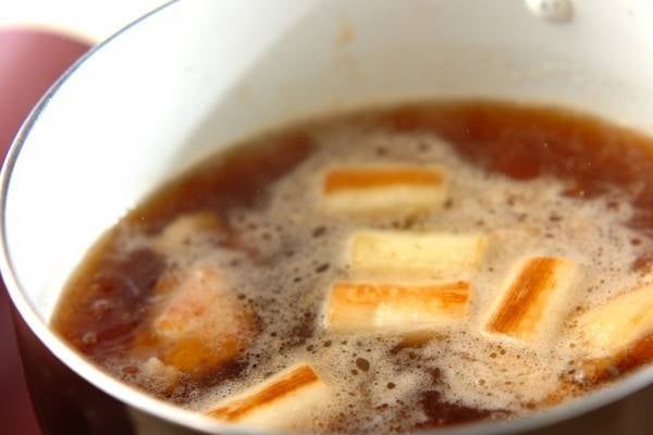 3、鍋に<調味料>の材料を加え、軽く温める。(2)を加え、中火で約5分煮込む。