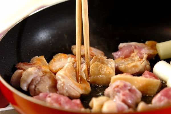 2、フライパンにサラダ油をひき、鶏もも肉と白ネギを加え、焼き色が付くように中強火で表面を焼く。