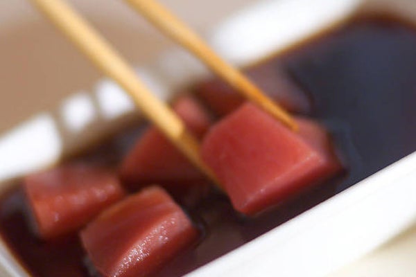 1、マグロのサクは8等分に切り、<つけダレ>を合わせた中に10分漬ける。