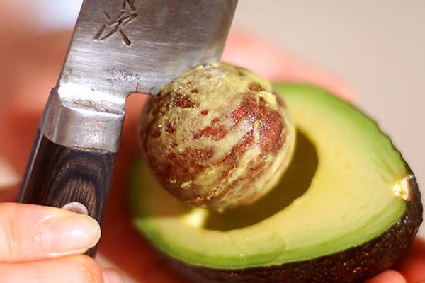 2、アボカドは縦に1周、種まで切り込みを入れる。手のひらではさんでねじるように2つに分け、種は包丁の角を刺してひねり取る。皮をむいて8等分に切り、レモン汁をかけて色の変色を防ぐ。