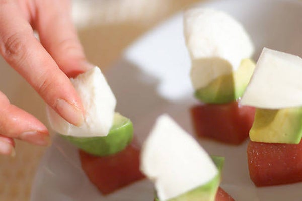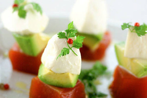 モッツァレラとマグロとアボカドを組み合わせた前菜。食べやすい一口サイズなので、つまようじや串で刺しておけば、手軽につまんで食べられそう。