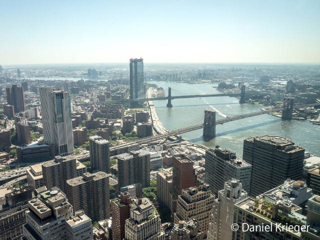 ダイニングルームから見降ろせるのは、ブルックリンブリッジ(写真下・手前の橋)にマンハッタンブリッジ(同・奥)。その向こうには、ブルックリンが広がる。また、エレベーターをはさんで反対側にはラウンジがあり、そこからは自由の女神を含む南方を見渡すことができる。