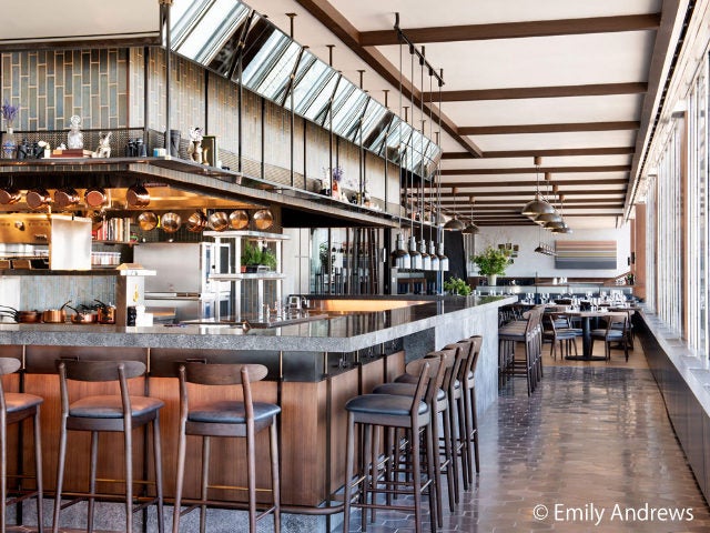 1階でコートチェックを済ませ、エレベーターで60階に上がる。長いカウンターを備えたバーを横目にマンハッタンの摩天楼を見ながらライブ感満載のオープンキッチン(写真下)の横を通り、ダイニングルームに案内される仕組みだ。