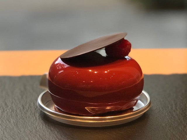 一口食べると、甘酸っぱいフランボワーズにアールグレーの香りが押し寄せる。その後ショコラのキレの良い苦みの華やかなハーモニーが広がり、最後は上品で爽やかな後味が口の中でしばらく続く。その移り変わりをぜひゆっくりと味わって欲しい一品だ。