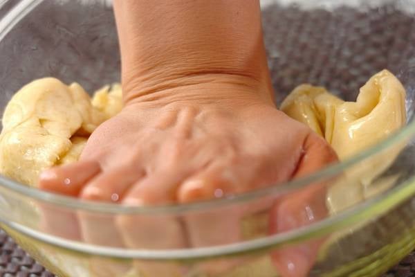 3、生地を3等分にし、ボウルに戻す。オリーブ油を入れ、生地に馴染むようにボウルの中でこねる。まとまってきたら、たたいてこねる作業を続ける。