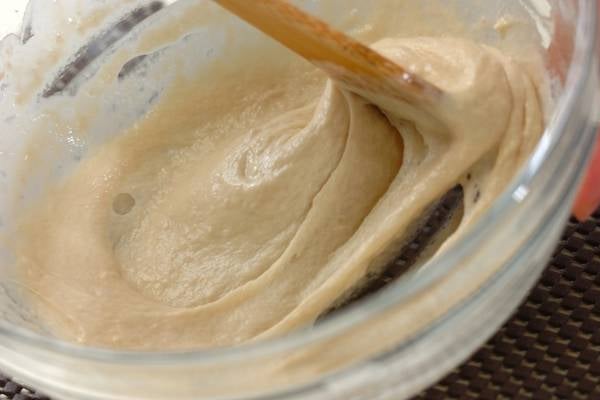1、ボウルに分量の強力粉の1/3量と、インスタントドライイースト、砂糖を入れ、ぬるま湯を注ぐ。木ベラで2~3分、粘りがでるまで全体を混ぜ合わせる。
