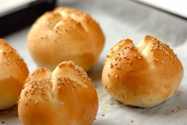 6、生地の表面に分量外の水をぬり、白ゴマを振る。はさみで縦に切り目を入れ、200℃に予熱しておいたオーブンで10分焼く。