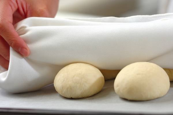 5、生地を4等分に切り、手の平で軽く押し、4つに折り込むようにして生地を丸める。閉じ目を下にして、天板に生地を置く。濡らした布巾をかけ、10分置く(ベンチタイム)。