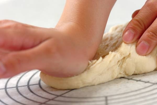 生地の一部を両手でのばし、向こう側が透けて見えるくらいになったらこね上がりです。