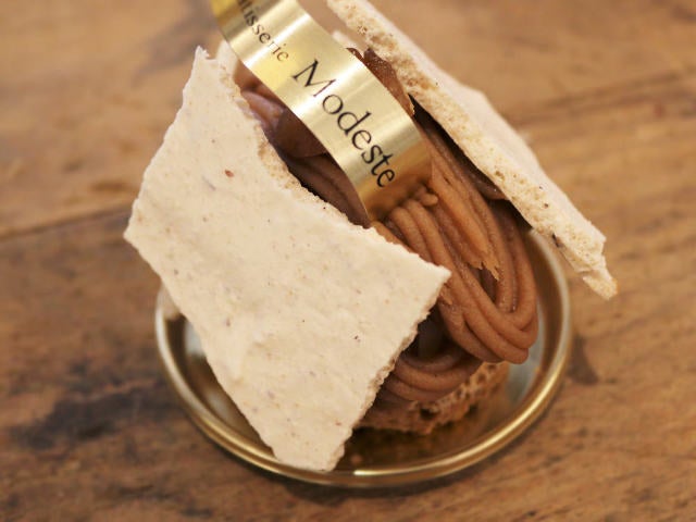 しかし、店に出て働くようになってからは日々の作業にも黙々と取り組み、次第に自分らしさを確立。同店で一番人気の「モンブラン」(写真下)は、独創的な見た目でありながら、いざ口に運ぶと豊かに広がるマロンの香りと繊細な食感には驚かされるばかり。