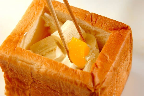 1、土台の食パンは、箱になるように中身をくり抜く。その中に生クリームとフルーツを詰める。くり抜いた食パンを入れてもOK。