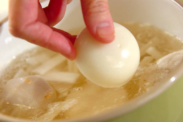 1、鍋にだし汁、大根、ニンジンを入れて火にかけ、大根が透き通るくらいまで煮る。