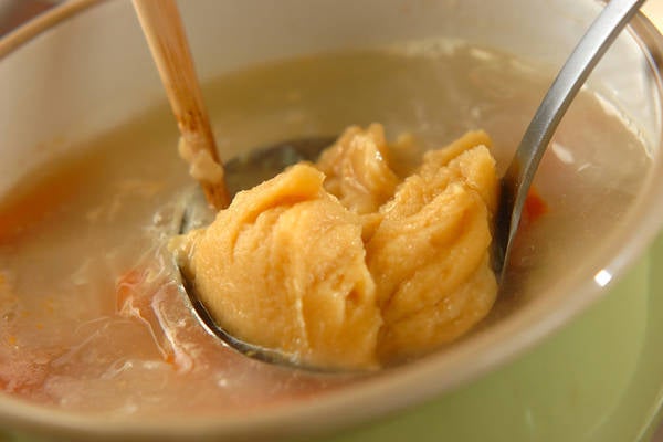 3、白みそを溶き入れて豆腐を加え、豆腐が温まったらお椀に入れる。糸かつお、柔らかめに溶いた粉からしをのせる。
